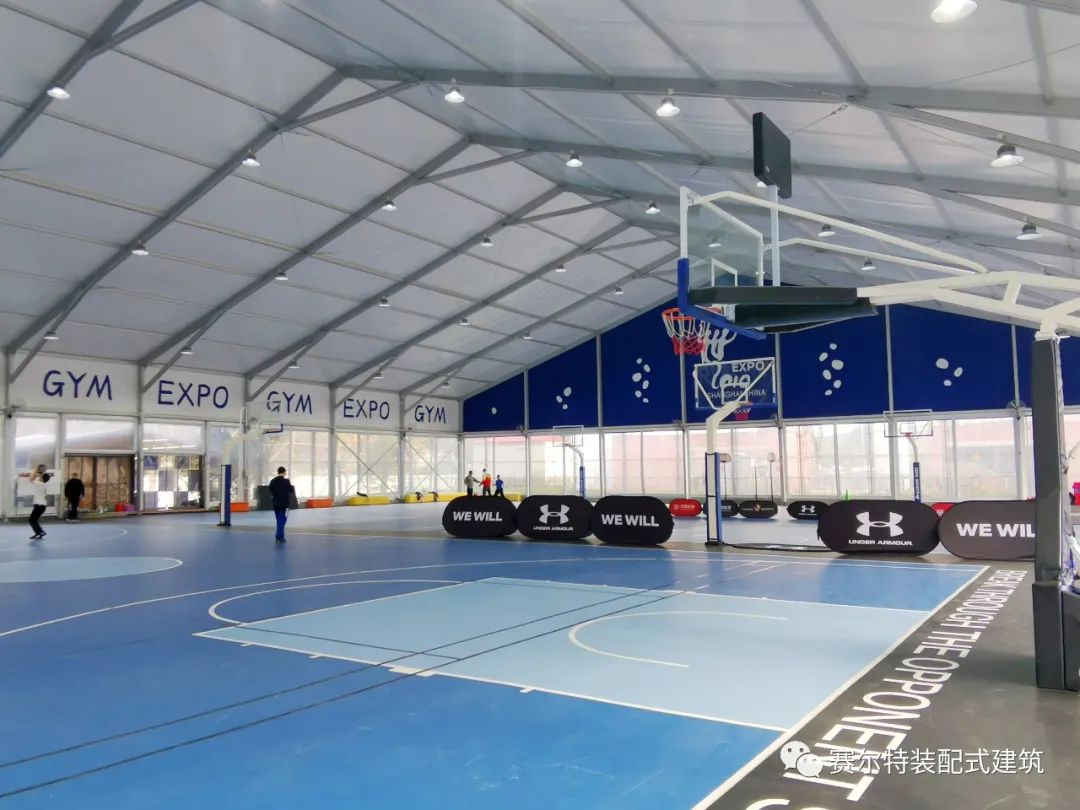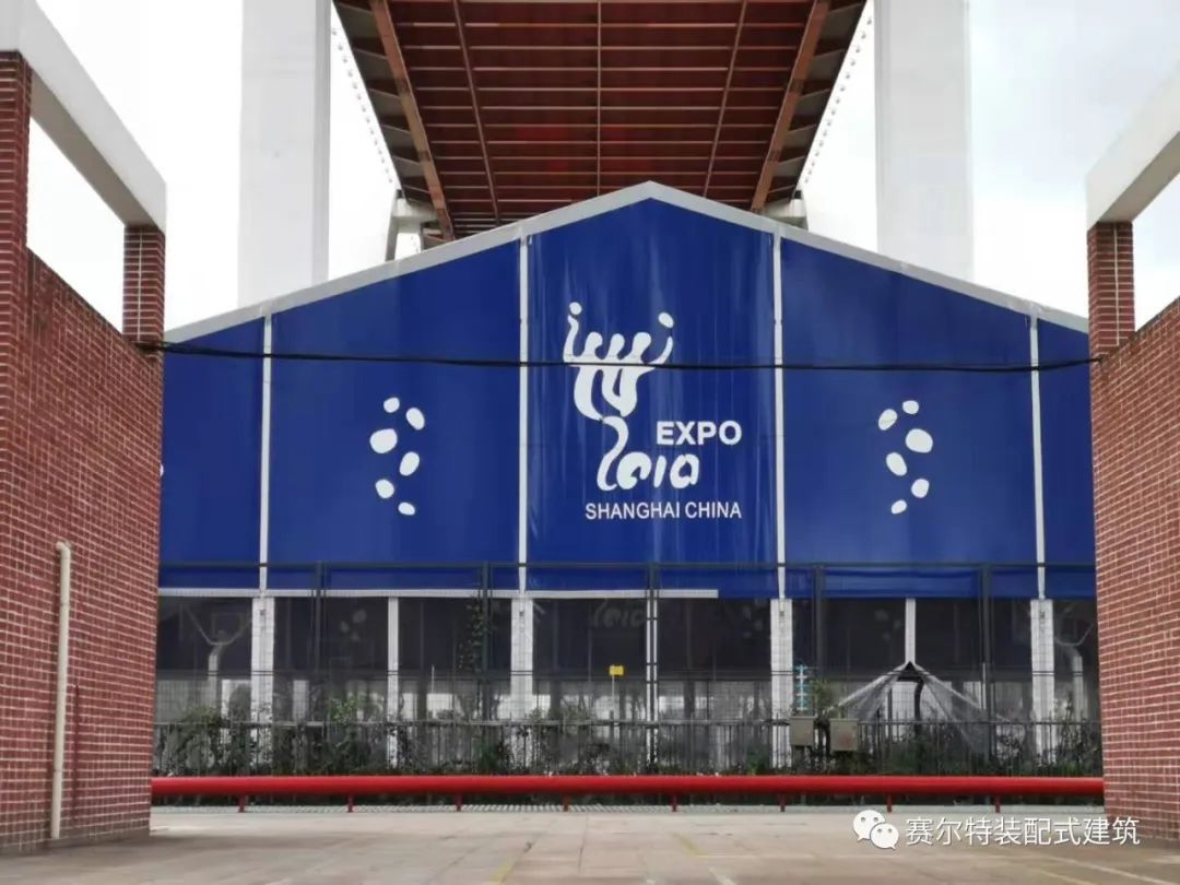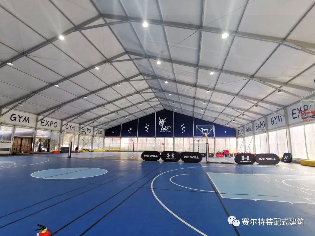 上海世博体育馆篷房的主型材采用航空级6061/T6铝合金,具有强度大、耐腐蚀、性价比高等优势。在篷布方面,采用的是定制宝蓝色篷布,具有较高的辨识度,而且比较耐脏实用。在造型方面,主要采用赛尔特M款篷房的坡屋结构,屋顶加置了钢缆,边墙加置十字撑,起到加固作用,极大地提高篷房的风载能力和雪载能力。四周墙则体采用了装配式的玻璃墙体和玻璃推拉门,不仅外观高大上,还能保证馆内的采光。