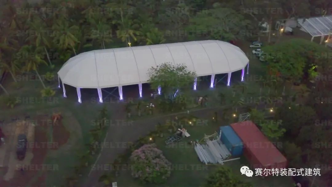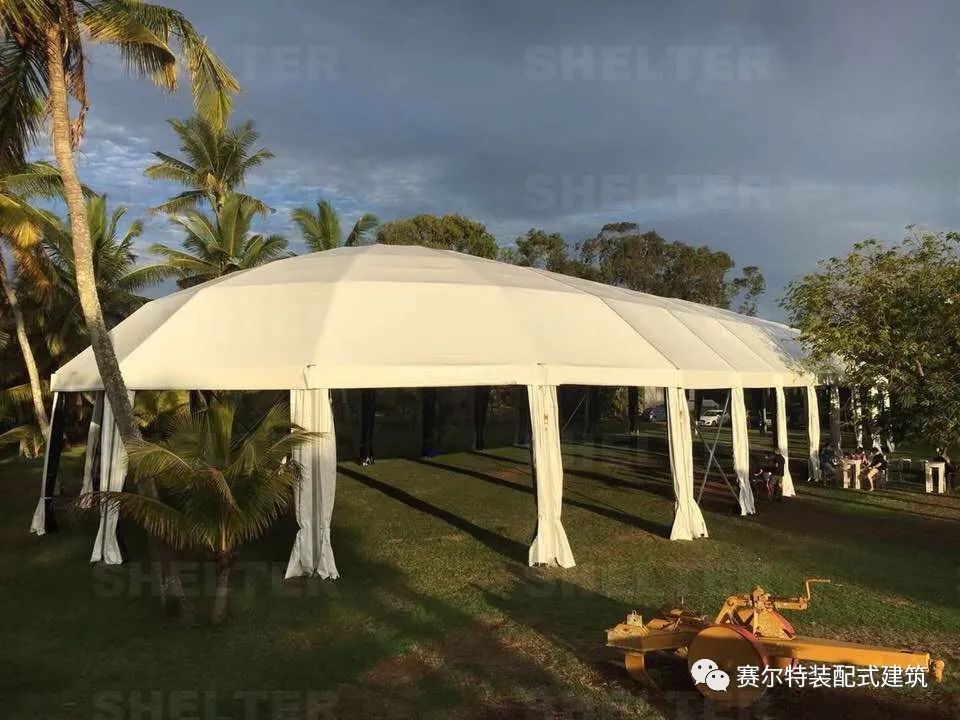 在篷布材质方面,赛尔特活动篷房的顶棚采用的是850g 双涂层纯白PVC篷布材质,周边门帘采用的是650g 半透明纯白PVC篷布材质,具有防水、阻燃、抗紫外线特点。